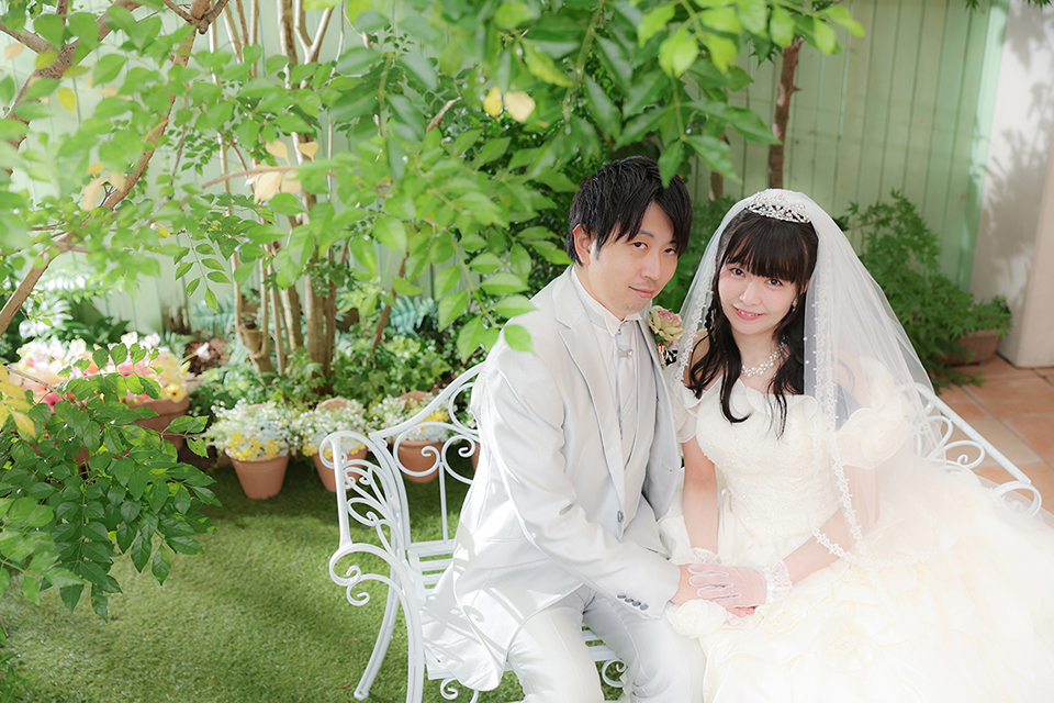 市川店のガーデンスタジオのベンチに座られたお二人。