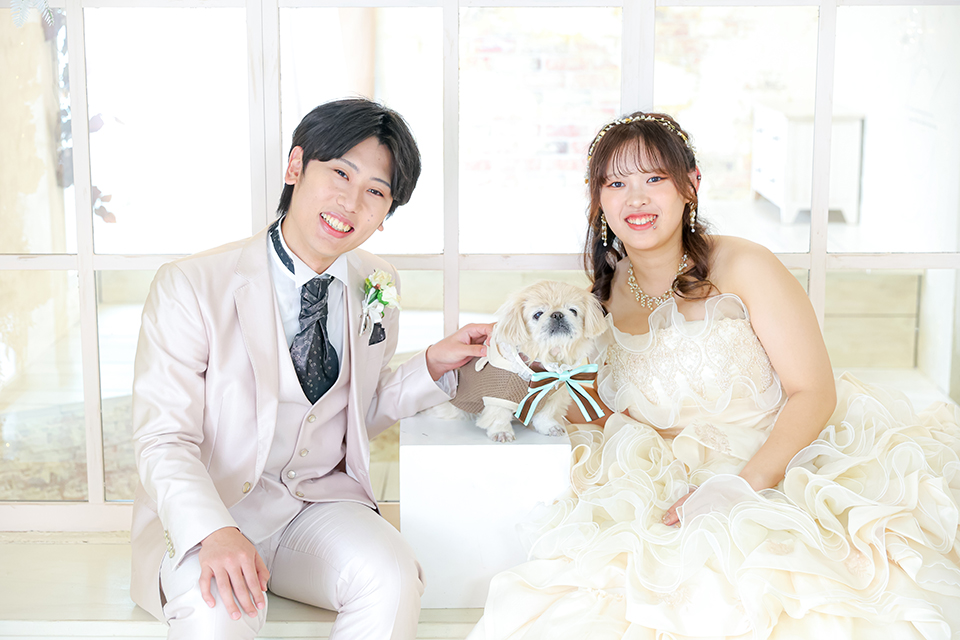 自然光スタジオで、愛犬と一緒にお撮りさせて頂いたお二人の笑顔が素敵なお写真です。