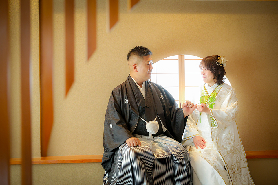 人気の和室スタジオで、見つめ合うお二人の笑顔がとても素敵なお写真です。
