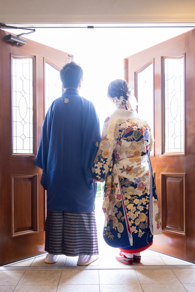 横浜店のエントランスで、羽織袴姿の新郎様と色打掛姿の新婦様をお撮りしたウェディングフォトです。