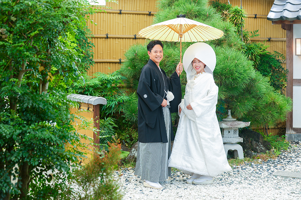 日本庭園スタジオで、相合傘をされるお二人の素敵なお写真です。