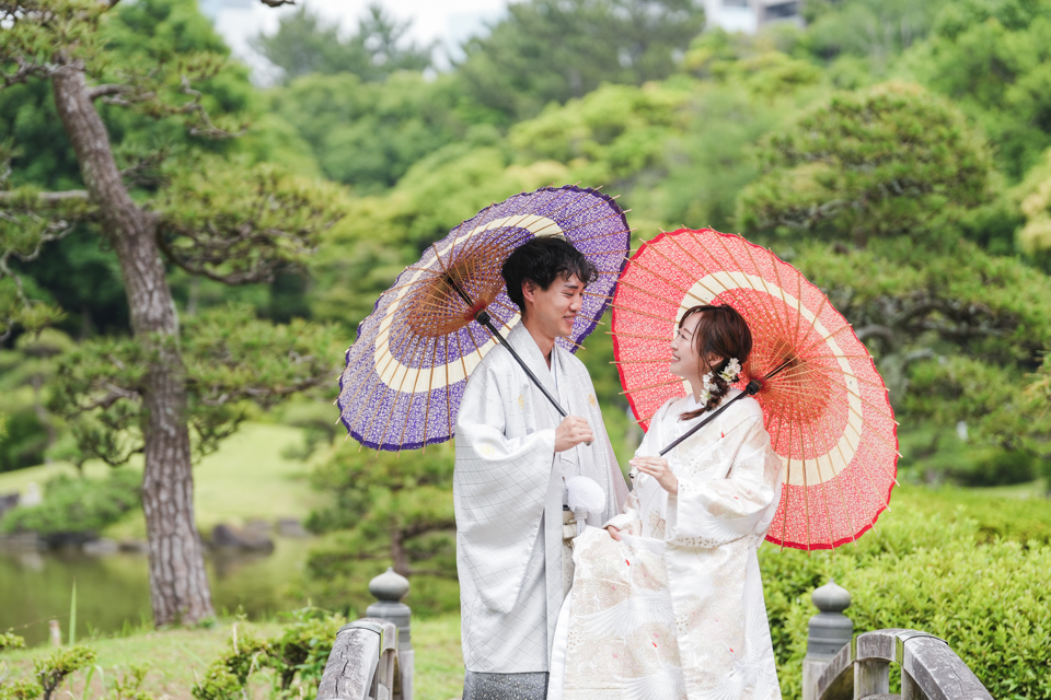 千葉市美浜区のフォトスタジオ「ウェディングストーリー幕張本店」の和装ロケーションウエディングのお写真です。日本庭園「見浜園」でお撮りさせていただいた素敵なポートレートです。