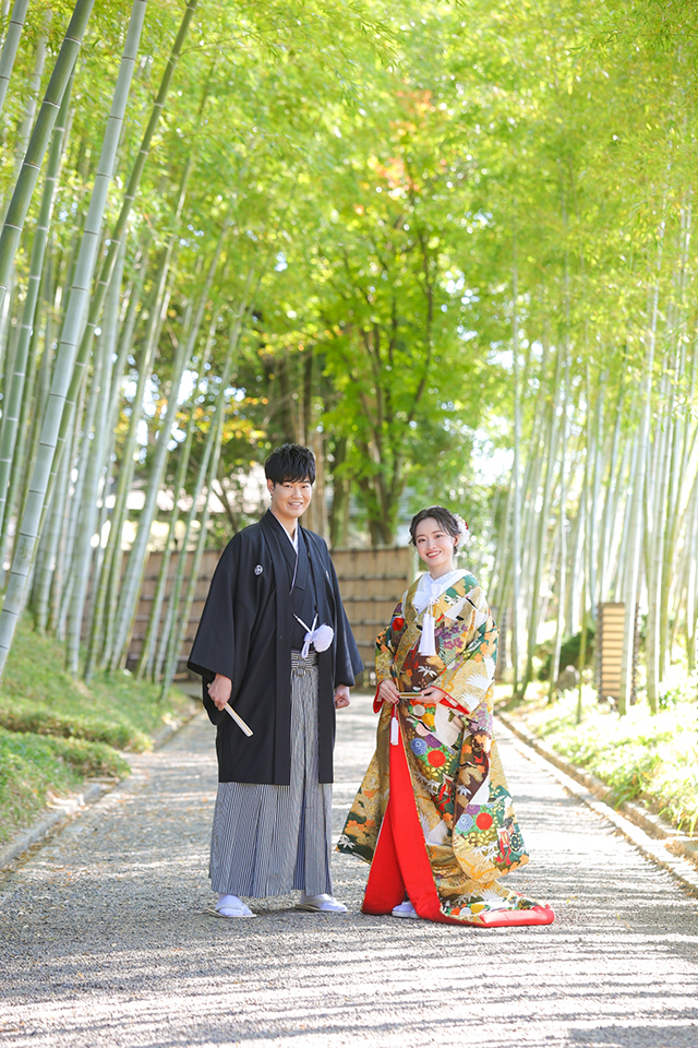 人気の竹林でフォーマルなポージングで撮影された素敵な1枚です。
