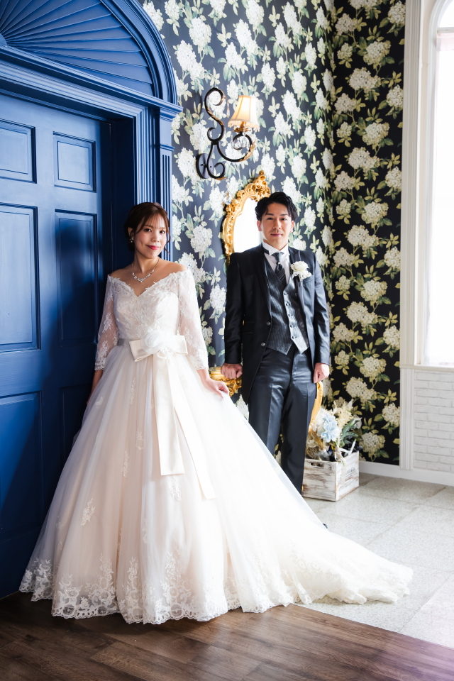 千葉市美浜区のフォトスタジオ「ウェディングストーリー幕張本店」の洋装スタジオウエディングのお写真です。ウェディングドレスでのスタジオ撮影を当店にて行わせていただいたお客様をご紹介いたします。プラン内容を気に入っていただき、このたび当館にご予約くださいました。