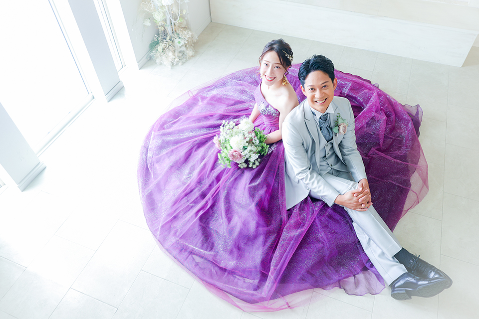自然光が差し込むホワイトスタジオで、ドレスを広げて座るお二人の笑顔が素敵なお写真です。