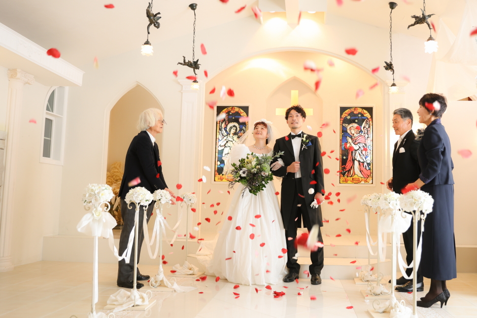チャペルスタジオにて、ご家族様にフラワーシャワーをしていただきながら撮影した一枚。笑顔と祝福の気持ちがあふれる、温かいお写真になりました。