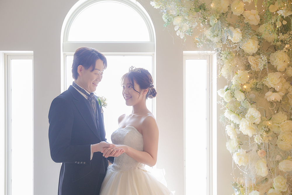自然光の差し込む窓際で新郎様新婦様が手をとり合い見つめ合う素敵な1枚です。