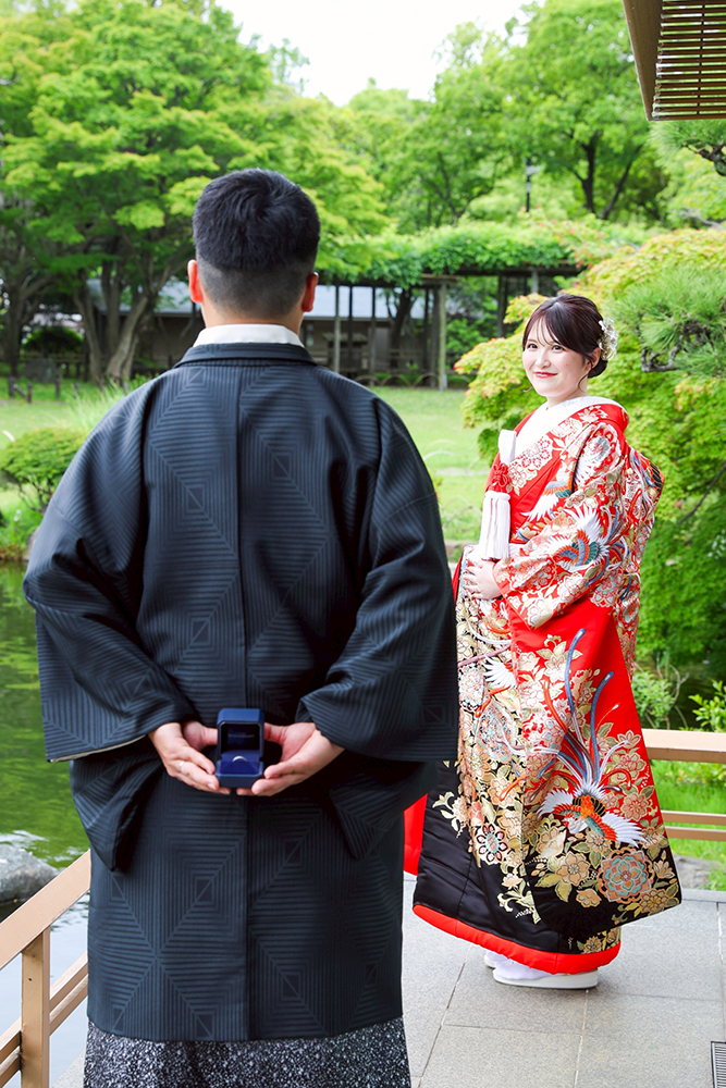 源心庵のテラスでプロポーズのサプライズ風の構図で撮影した素敵な1枚です。