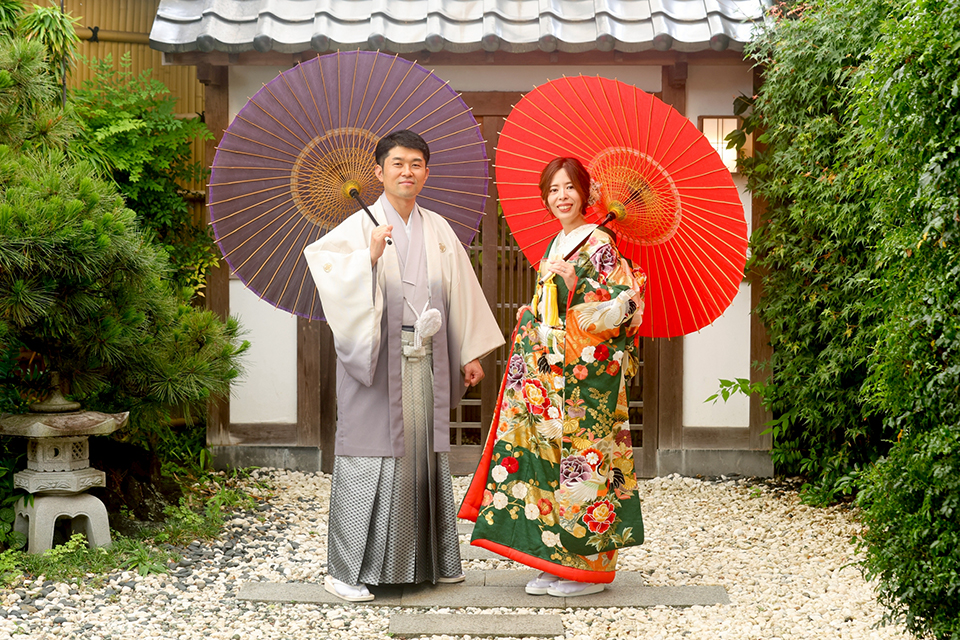 日本庭園スタジオの数寄屋門の前で、和傘を肩に笑顔が素敵な1枚となりました。