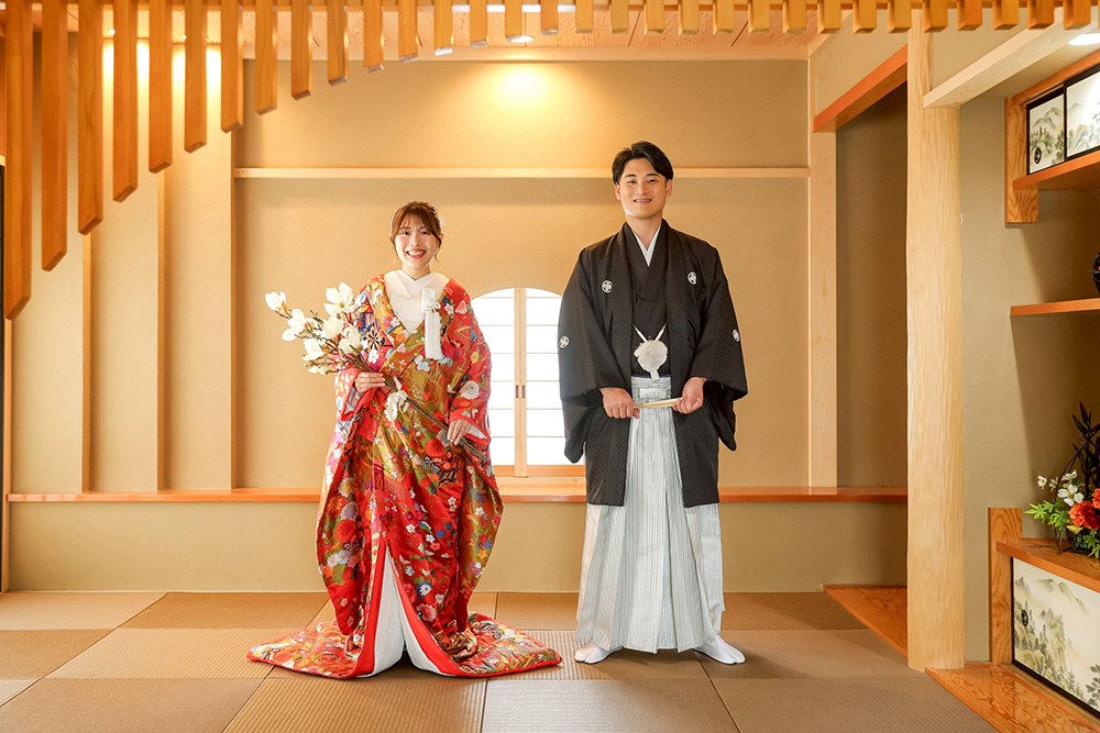 和室スタジオで木蓮や扇子を小物に使い笑顔のお二人を撮影した素敵な1枚です。