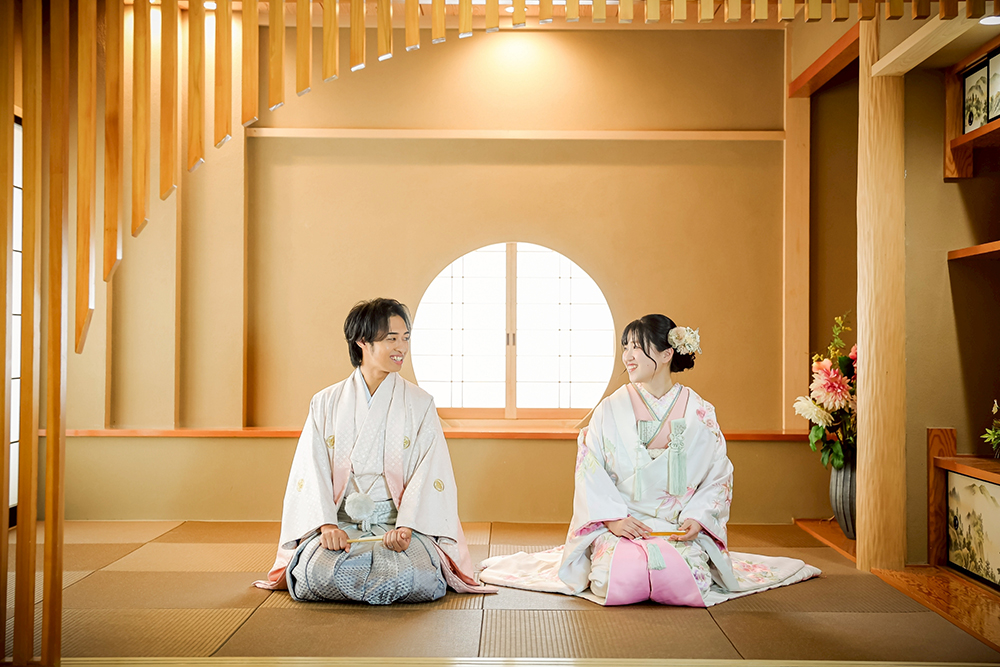 和室スタジオでお二人が正座して見つめ合っている素敵な1枚です。