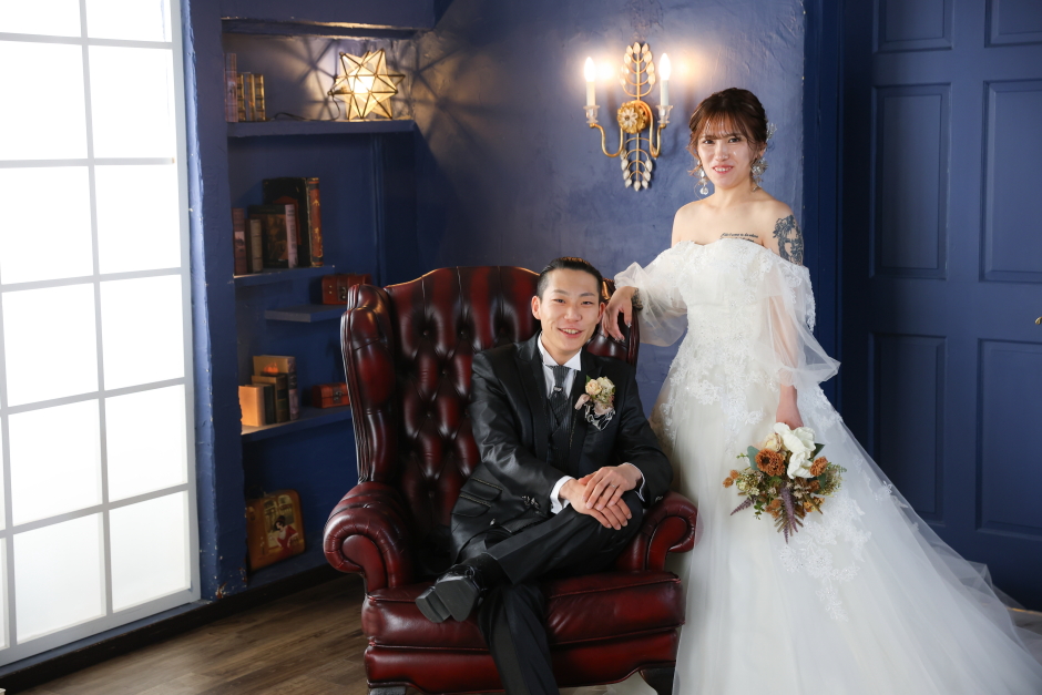 千葉市美浜区のフォトスタジオ「ウェディングストーリー幕張本店」の和洋装ウェディングスタジオ3着プランのお写真です。シックなダークブルーのスタジオでお撮りしたお二人の素敵なポートレートです。
