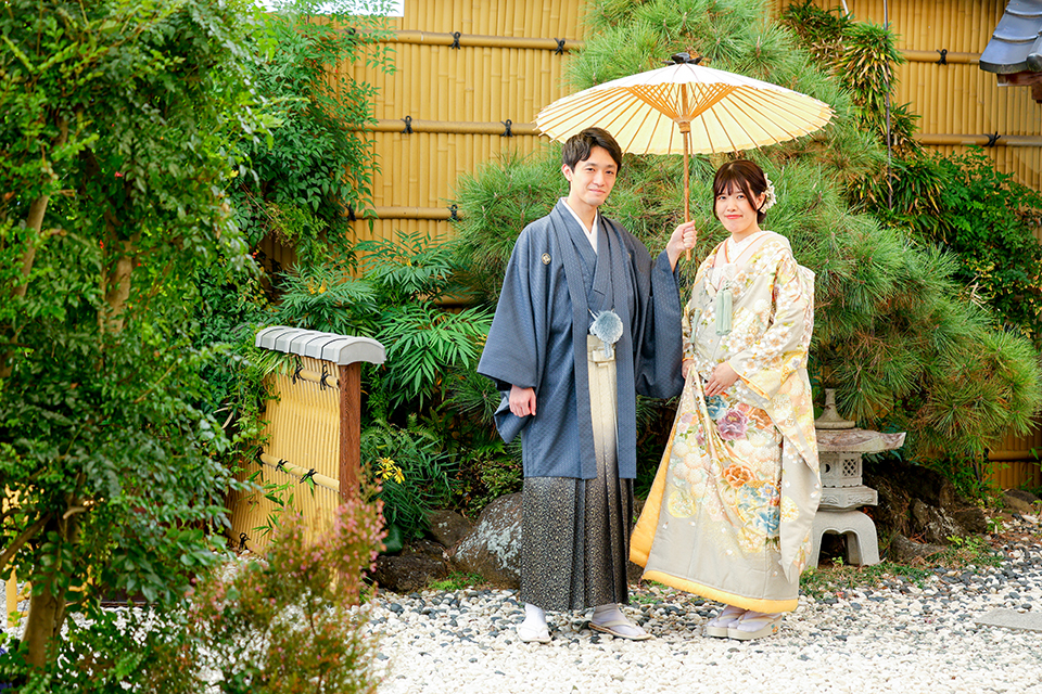 日本庭園スタジオで、相合傘をされるお二人の笑顔がとても素敵なお写真です。