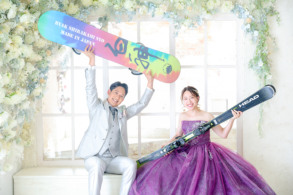 白いドライフラワーで装飾されたスタジオで、スノーボードとスキー板を持つお二人の笑顔が素敵なお写真です。