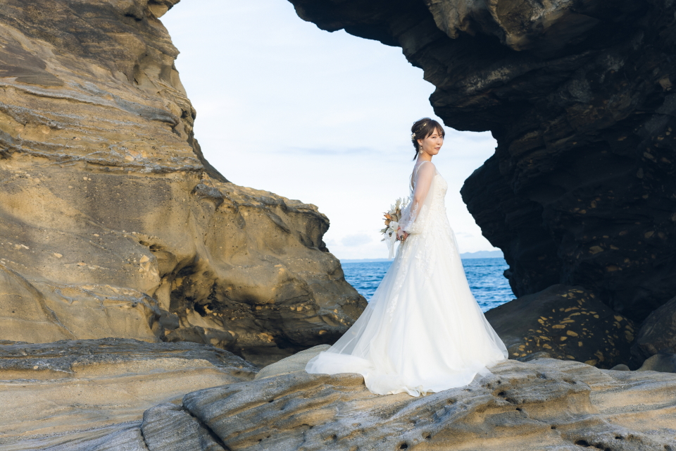 青い海と特徴的な岩肌にドレス姿の新婦様が大変美しい1枚となりました。