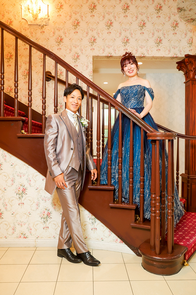 松戸市のフォトスタジオ「ウェディングストーリー松戸店」にて、和洋装3着ウェディングスタジオプランをご利用されたお客様のお写真です。人気のヨーロピアン階段で段差を使ってお二人に並んでいただいた1枚です。