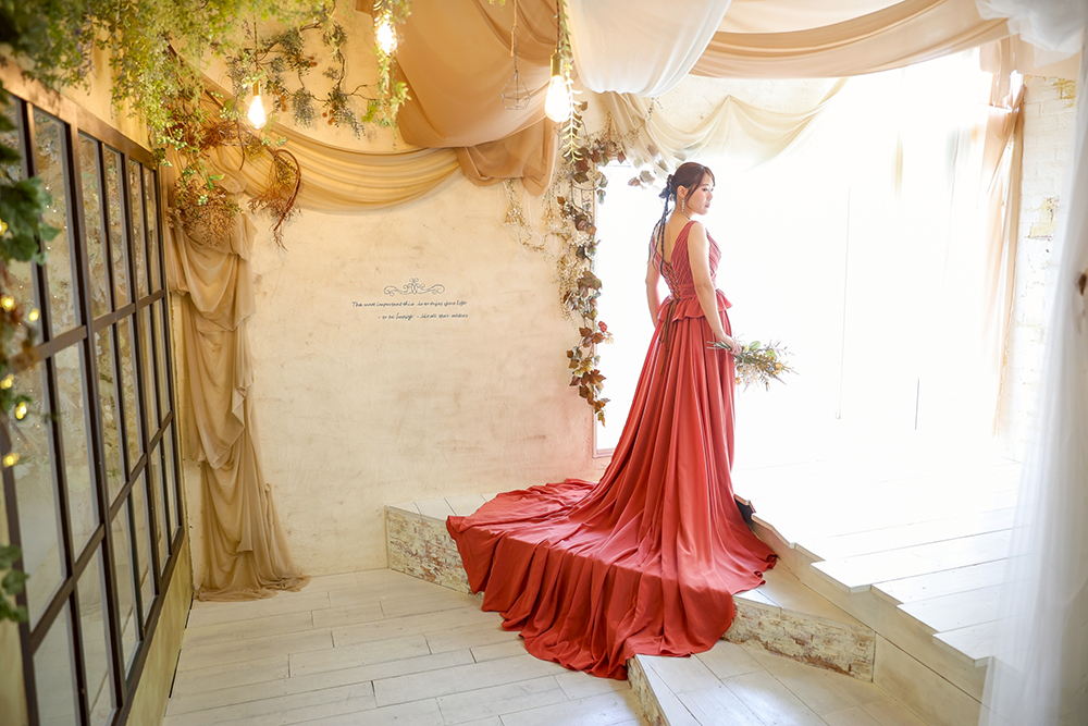 新婦様は洋装のカラードレスでバーミリオンカラーのステキなドレスををお選びになりました。