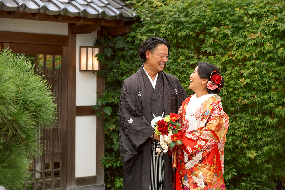 松戸市のフォトスタジオ「ウェディングストーリー松戸店」にて、和洋装2着ウェディングスタジオプランをご利用されたお客様のお写真です。庭園スタジオでお二人がブーケをお持ちになって微笑み合う素敵な1枚です。新婦様は色打掛は朱色に鶴などの刺繍が入った素敵なお衣装をお選びになりました。新郎様は黒の紋付羽織袴です。