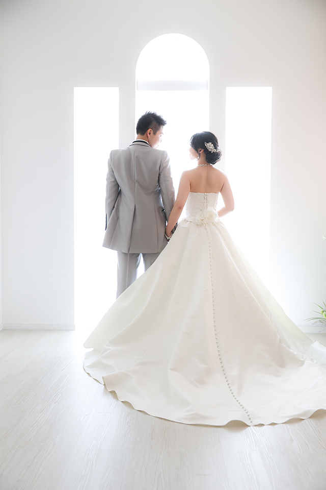 ウェディングドレス姿のお嫁様と、タキシード姿のご新郎様を市川店の自然光の入る大きな窓の前でお撮りしたバックショット。