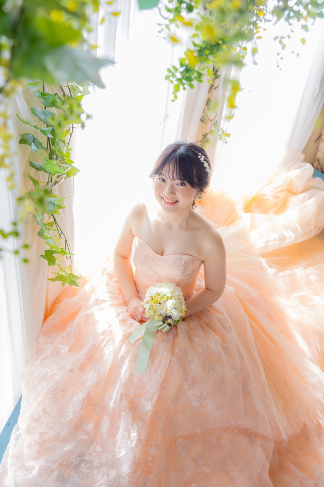 お衣装は淡いオレンジのドレスをお召しになった新婦様。