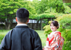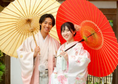 和室スタジオでブーケを手に見つめ合って微笑む