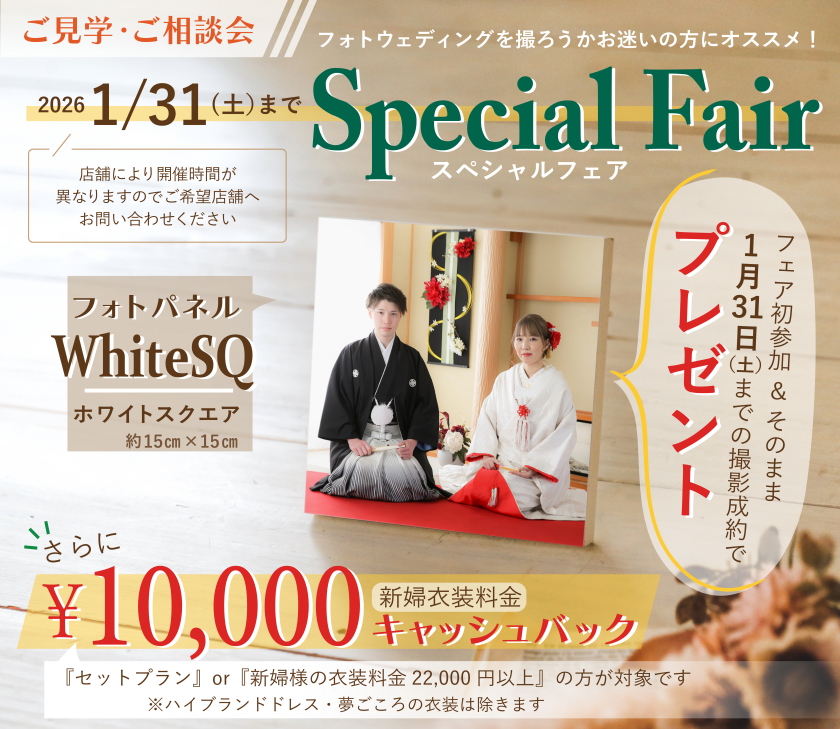 2025/10/30 参加特典有り!スペシャルフェア 2026年1月31日まで キャンペーン 全店舗 ウェディングフォトを撮るかお悩み中の方に朗報です! フェア来店時、そのまま撮影のご成約でフォトパネルプレゼント中です! さらに、新婦衣装料金のキャッシュバックも同時開催中! WEB予約からのご見学・ご相談もご利用ください。 ご予約はこちら 該当店舗 全店舗