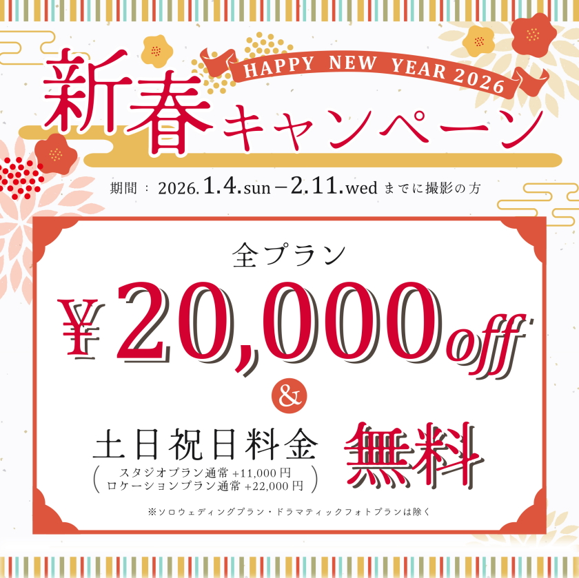 2025/12/01 新春キャンペーン 開催いたします!(2026年1月4日~2/11日 撮影の方) キャンペーン 全店舗 2026年新春期間限定キャンペーンは、 全てのスタジオプラン又はロケプラン→20,000円OFF! ※店頭にてその他のご予約特典もございます! どうぞご相談・ご来店お待ちしております!! ※期間は2026年1月4日~2/11日までの撮影の方で撮影日以前にご申告のあった方のみ対象です。 ぜひ、お問い合わせ・ご予約をお待ちしております♪ 該当店舗 全店舗